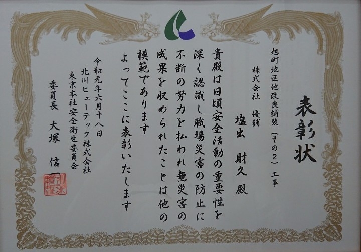 安全表彰を頂けるということは、弊社にとっては、大変光栄なことで