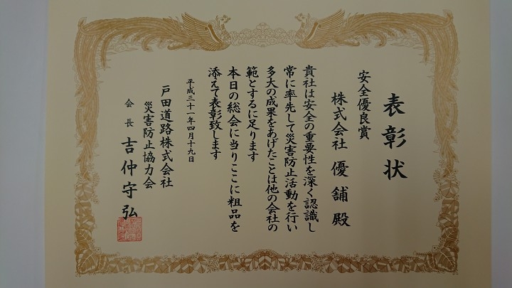 安全優良表彰(会社の部・職長の部)を受賞しました。