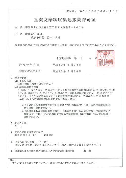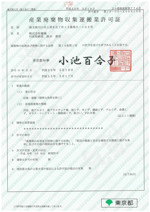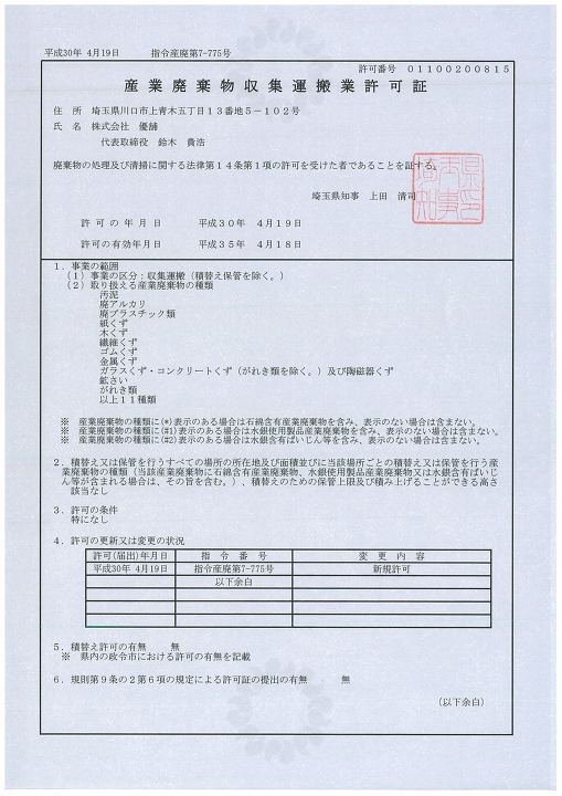 ついに産業廃棄物収集運搬許可がおりました。
