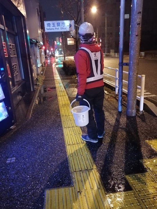 夜間の凍結防止にむけて融雪剤の散布に向かうことに・・・。